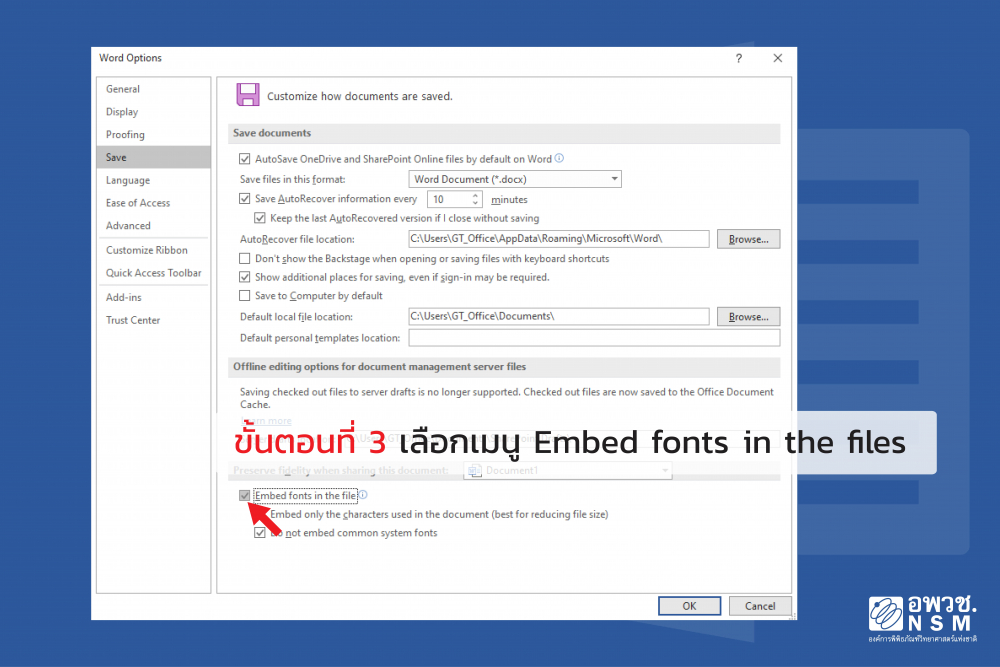 Microsoft Word เป็นโปรแกรมสำหรับจัดทำเอกสารที่นิยมกันมากในปัจจุบัน แต่เราอาจเคยประสบปัญหาเวลาบันทึกเอกสารจากเครื่องหนึ่งแล้วไปเปิดอีกเครื่องหนึ่ง หรือส่งให้เพื่อน ตัวอักษรในเอกสารมักจะแสดงผลคลาดเคลื่อนเนื่องจากFont ของทั้งสองเครื่องไม่ตรงกันนั่นเอง วิธีการแก้ปัญหาคือการฝัง Font ลงไปในไฟล์เอกสารขณะที่เราบันทึก